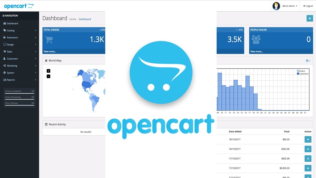 Opencart e ticaret platformu. Tüm önemli bilgileri tek pencerede. Toplam siparişler, satışlar, müşteriler, çevrimiçi kişiler, satış analizi ve daha pek çok widget ile nelerin önemli olduğuna dair genel bilgileri tek panelde görebilirsiniz. Opencart yönetim paneli kullanılabilinirlik olarakta çok kolaydır. E Ticarete ilk defa başlıyorsanız bile anlamanız ve yönetmeniz fazla zamanınızı almayacaktır.